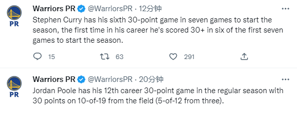 勇士先后输给黄蜂和活塞遭遇两连败,开赛至今勇士3胜4负暂时排名西部第十,库里7战6次单场轰下30+,这是库里生涯首次开赛前7场6次轰下30+;普尔也遭遇里程悲,生涯第12次单场轰下30+。