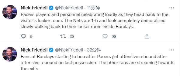 据名记Nick Friedell报道,比赛最后时刻,巴克莱中心球馆的球迷开始狂嘘主队,还有很多球迷提前离场;篮网众球员士气低落,缓慢地走回更衣室;步行者众球员则是高呼胜利返回更衣室,两队形成鲜明的对比。