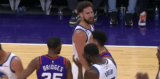 值得一提的是,这场比赛克莱在第三节中段被驱逐,他先是和布克纠缠,暂停的时候和对手冲突,被裁判出示技术犯规。之后克莱朝着裁判表达不满,再度吃到技术犯规,被直接驱逐。克莱被驱逐之后,勇士的表现很糟糕,被太阳打了波51-28,净负23分,三分球只有尴尬的12中1,表现很差。