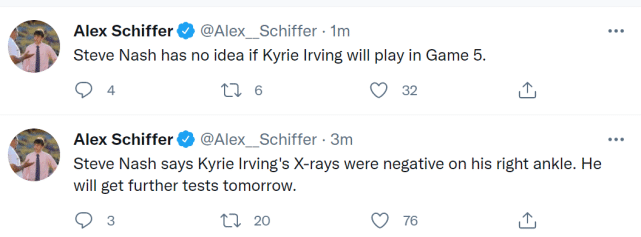 比赛第二节打到一半时,意外发生,欧文在一次上篮落地时,踩到了字母哥的脚面上,崴到脚踝,痛苦倒地。他在工作人员的搀扶下,一瘸一拐地返回更衣室。退场前,欧文打了17分钟,得到11分5篮板2助攻1抢断1盖帽,投篮11中5。不少球迷指责字母哥有垫脚的嫌疑,字母哥在赛后采访时祝福欧文早日康复,希望他能赶上G5的比赛。