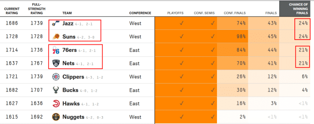 目前的夺冠概率排名如下:爵士24%,太阳24%,两队并列第一;篮网21%、费城21%,两队并列第三。快船6%排名第五,雄鹿4%位居第六,老鹰和掘金没有变化,同为不足1%,一起垫底。