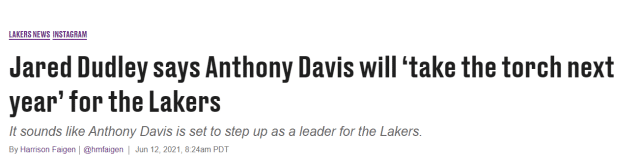 美媒指出,无论这一幕是否在下赛季发生,杜德利都是对的:未来的某个时刻,詹姆斯要退到浓眉的身后,明年他将年满37岁了,是时候让戴维斯去领导这支球队,并完全掌控更衣室了。