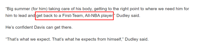 这不是杜德利第一次公开鼓励戴维斯。此前,他多次称赞戴维斯在更衣室的领导力不断提升。“对于戴维斯来说,这是一个关键的夏天,他要照顾好自己的身体,来到我们需要他的位置上,并重回最佳阵容一阵 ,”杜德利对浓眉很有信心,“这是我们对他的期望,也是他对自己的期望。”