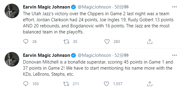 湖人名宿魔术师发推写道,在季后赛中,爵士联盟最平衡的球队;更是盛赞爵士核心:米切尔已经是真正的超级巨星,西部半决赛G1轰下45分和G2看下37分,今后讨论超级巨星时,除了詹姆斯、杜兰特和库里等人之外,必须提到米切尔的名字。
