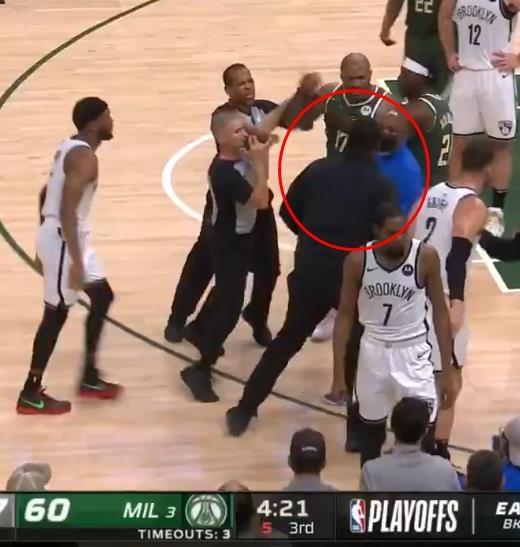 当场上发生冲突的时候,作为篮网队的工作人员,这黑哥们冲上场是被允许的,而且他除了顶开塔克避免让他靠近杜兰特之外,一直护在杜兰特身前,并没有什么出格的动作,所以这哥们大概率不会被处罚,不过从这一点,我们也能够看到蔡老板对于杜兰特的重视,不过如今点赞网红的风险已经这么大了吗?