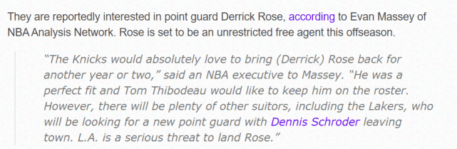 “尼克斯当然想把罗斯带回纽约,再打一两年,”Massey在文中写道,“他完美匹配尼克斯的体系,锡伯杜教练也想把他留在阵容中。尽管如此,罗斯也会有足够多的追求者,其中包括湖人队。施罗德可能会离开湖人,他们需要一个新控卫。对于尼克斯来说,湖人将是他们引进罗斯的巨大威胁。”