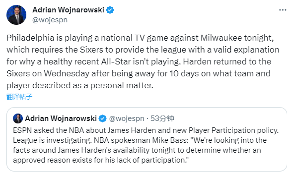 ESPN向NBA询问了詹姆斯-哈登和新的球员参赛政策的情况。联盟正在进行调查。NBA发言人迈克-巴斯:我们正在调查詹姆斯-哈登今晚无法参赛的事实,以确定他缺席的原因是否包含经过批准的原因。