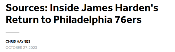 ESPN报道了76人后卫詹姆斯-哈登将缺席球队赛季揭幕战一事的后续影响。