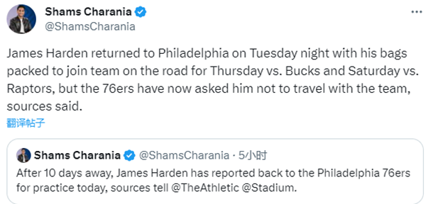 名记shams报道,哈登已经归队参加了球队的训练,他准备参加76人与雄鹿猛龙的客场比赛,但76人要求他不要随队出行。