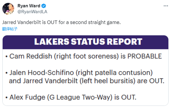 24直播网10月26日,湖人官方公布下一场对阵太阳的伤病报告,雷迪什(右脚酸痛)大概率出战,范德比尔特(左脚后跟酸痛)和席菲诺(右髌骨挫伤)因伤继续休战,福奇前往G联赛也缺席比赛;詹眉带队冲击赛季首胜,太阳三巨头有望首次合体。
