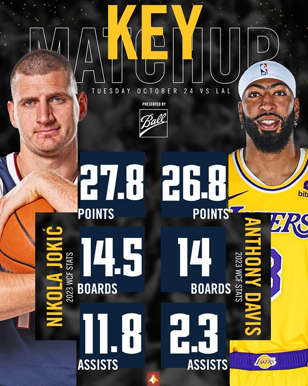 上赛季西部决赛,约基奇场均拿到27.8分14.5篮板11.8助攻,浓眉则是场均拿到26.8分14篮板2.3助攻,在这一轮系列中,约基奇带队4-0横扫湖人,并且全票夺得西决MVP,最终带队夺冠以及夺得FMVP;掘金将在今天举办总冠军戒指颁奖仪式。