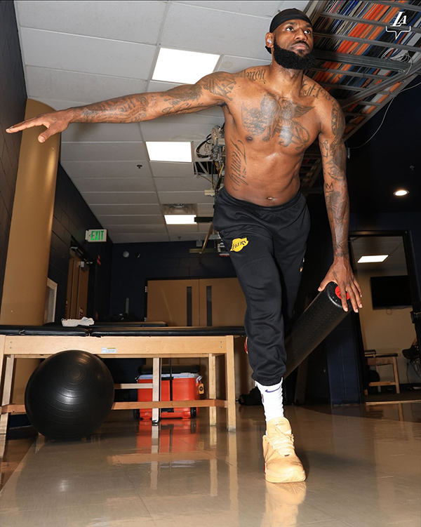 抵达球馆后,詹姆斯换上训练服并且赤膊热身积极备战掘金。