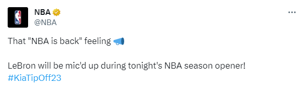 湖人新赛季揭幕战客场挑战卫冕冠军掘金,詹姆斯将在今天正式开启生涯第21个赛季,NBA官方报道,湖人球星詹姆斯将在本场比赛中全程佩戴麦克风。