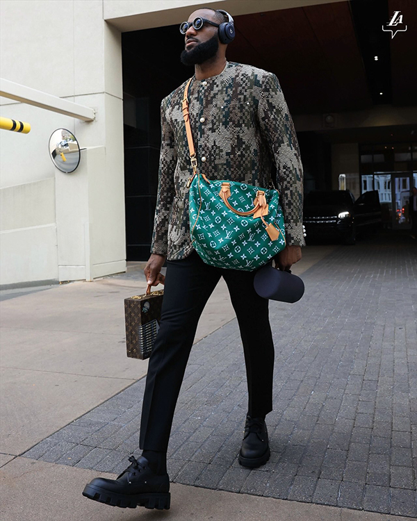 湖人官方晒照——詹姆斯穿着皮鞋、戴着墨镜和耳机、提着保温杯、斜挎名包正式抵达掘金主场,表情严肃帅气亮相。