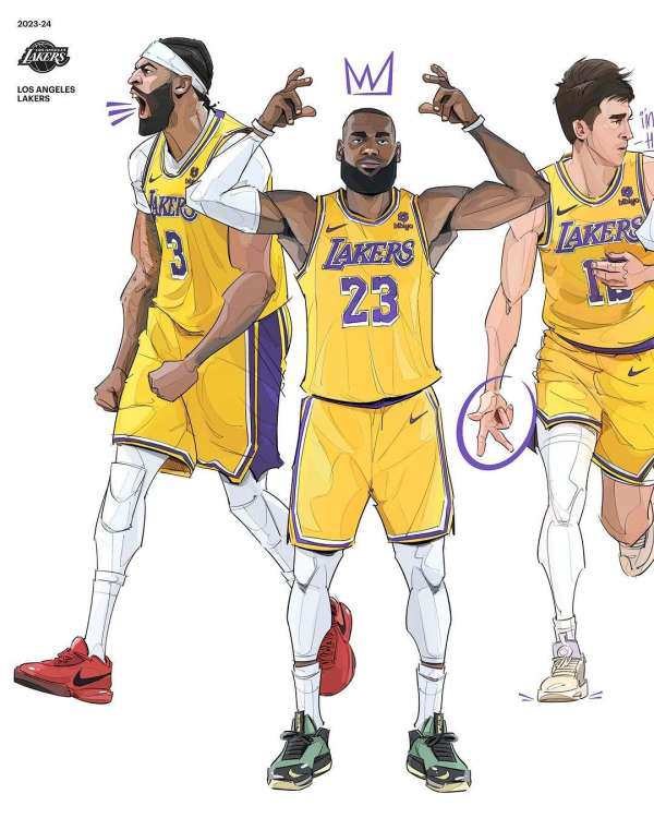 在湖人全队漫画版合影中,17名球员都在其中,詹姆斯和浓眉两大巨头位居C位凸显球队的地位,老詹身穿23号并且做出戴王冠的庆祝动作;浓眉戴着发带怒吼,八村垒身背日本武士刀十分抢镜。