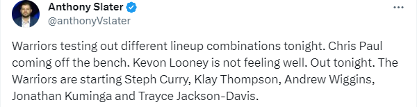勇士主动变阵保罗替补!库明加搭档库里克莱首发 卢尼格林缺战