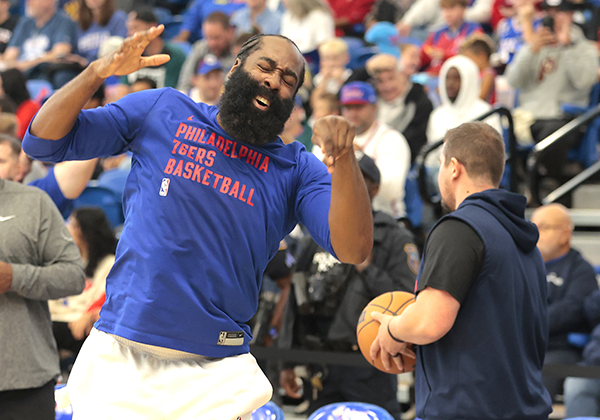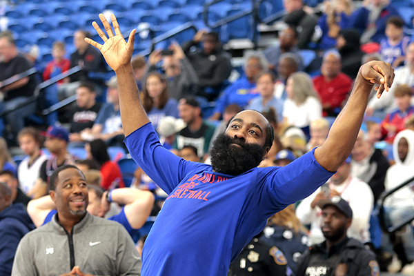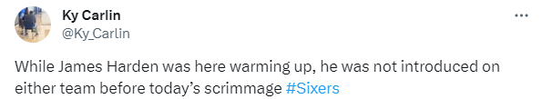 赛前哈登出现在球场上,和队友一起进行了热身,哈登面带笑容以及搞怪投篮,还在现场做俯卧撑;不过他缺席了这一场公开的队内蓝白对抗赛——在蓝白分队时,哈登没有进入任何一队,而且也没有被介绍给球迷,据报道,这是哈登和76人双方的共同决定。