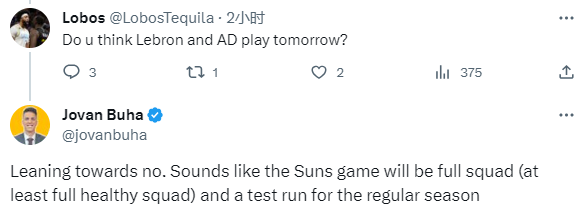 一位球迷在推特上询问:你觉得勒布朗和AD明日(对阵雄鹿)会出战吗?