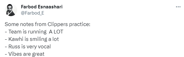 快船跟随记者Farbod Esnaashari总结快船队内训练,发推写道:球队训练量很大,小卡笑得更多了,威少很能发声,球队氛围超级棒。