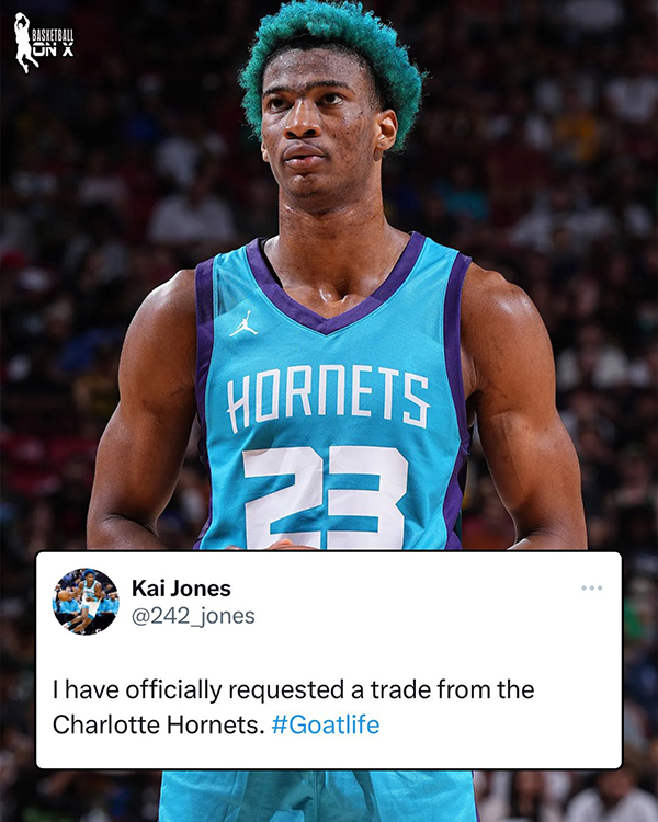 嘲讽队友坦言自己比三球和布兰登-米勒更好,狂言能够打爆巅峰期的乔丹詹姆斯和奥尼尔,自封GOAT;对于琼斯的各种言论,黄蜂队介入调查,并且已经宣布琼斯因个人原因无限期离队,之后琼斯亲自宣布:我已经正式向夏洛特黄蜂申请交易。