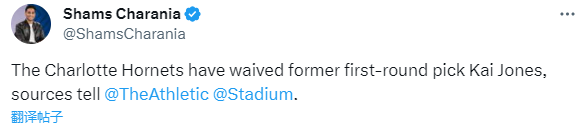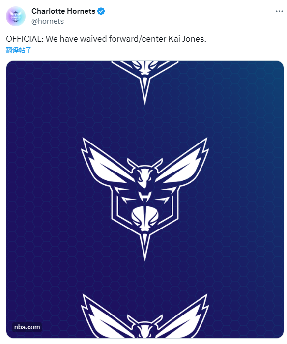 24直播网10月12日讯 ,据名记shams报道,黄蜂已经已经裁掉了他们的首轮秀球员凯-琼斯;之后黄蜂官宣裁掉琼斯;今夏22岁的琼斯经常发表一些疯狂的言论,曾狂言他能打爆巅峰期的乔丹、詹姆斯和奥尼尔,嘲讽以及贬低队友,还宣布他已经申请离队。