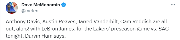 24直播网10月12日讯 ,NBA季前赛湖人对阵国王,赛前湖人主帅哈姆宣布,詹姆斯、浓眉、里夫斯、雷迪什和范德比尔特都缺席比赛,其中雷迪什(右脚踝酸痛)和范德比尔特(左脚跟酸痛)都是因伤休战,詹眉和里夫斯则是集体轮休不打。