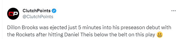 狄龙火箭首秀惨遭驱逐:下黑手袭裆泰斯吃二级恶犯 0分黯然离场