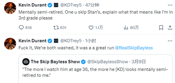 名嘴Skip Bayless在节目中表示:我越是观察36岁的他,就越觉得他(杜兰特)在心理上处于半退役状态。