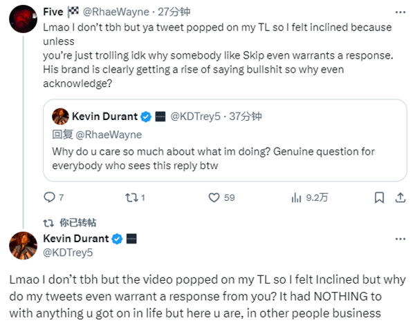 杜兰特回复:哈哈,说实话我并不想,但视频在我的账号上弹出来,所以我感觉很想回应,但为什么我的推文值得你回应?这与你生活中的任何事情都无关,你却在这里管别人的事。