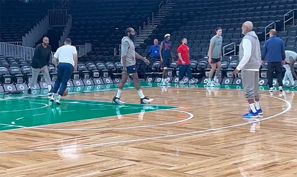 哈登缺席76人季前赛揭幕战,不过他随队来到波士顿,赛前,哈登身穿76人训练服在TD北岸花园球馆热身;从曝光的现场画面可以看到,哈登外线持球突破,撞开陪练后强硬得分,之后哈登虚晃迎着防守命中三分球,大胡子的体型和状态都保持的不错。