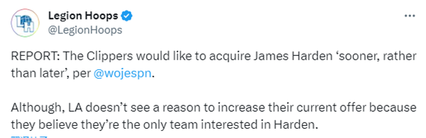 究竟哈登能否在常规赛开始前如愿离队?据名记woj报道,快船希望尽快完成哈登交易,但他们拒绝提高报价,因为他们相信他们是唯一提供报价的球队。