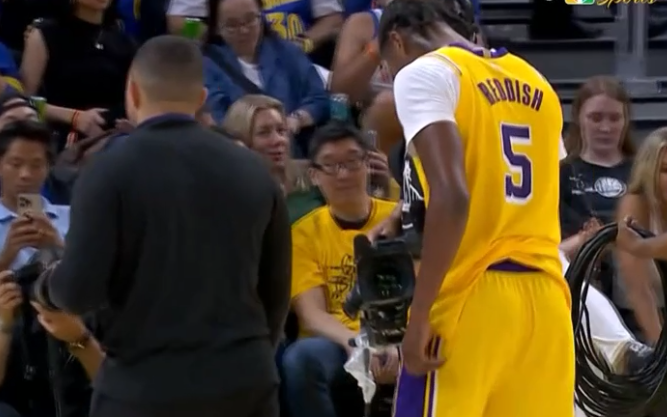 第四节还剩10分多钟,雷迪什在一次防守时不慎崴脚,右脚扭了一下,痛苦倒地双手抱头,湖人主动喊暂停,之后詹姆斯等球员都围过来,十分担忧雷迪什的身体;雷迪什换了一会后缓缓地站起来,之后与湖人工作人员一起返回更衣室,雷迪什走路有些颠簸。