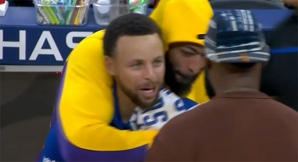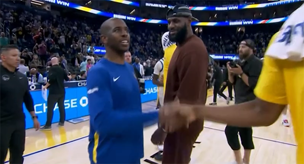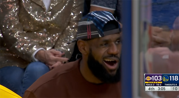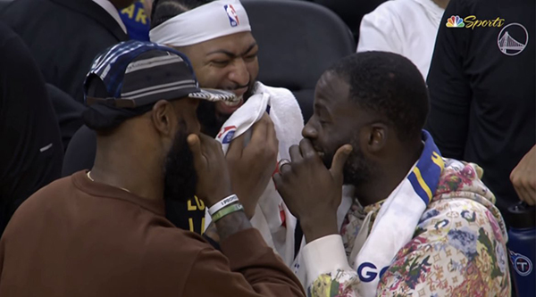 詹姆斯轮休仍抢镜:坐场边打哈欠看困 湖人双巨拥抱库里热聊乐开怀