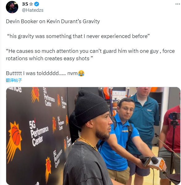 对于杜兰特在比赛中的影响力,布克表示:他的引力是我以前从未体验过的,他引起了如此多的关注,你无法用一个人来防守他,他能强制改变对手的轮换,创造轻松的得分机会。