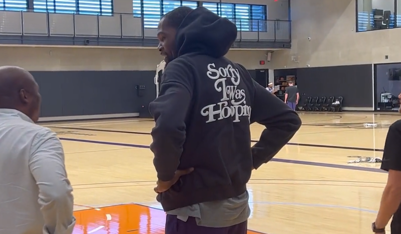 杜兰特身穿连帽卫衣参加训练,背后印着“Sorry I was hooping”。