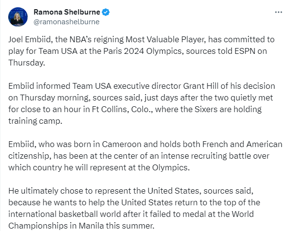 恩比德拥有美国、法国和喀麦隆三个国家的国籍,他最终选择代表美国男篮出战的原因是他希望帮助美国男篮重返世界篮球之巅。