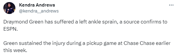 ESPN名记Kendra Andrews跟进报道,追梦确实遭遇了左脚踝扭伤,本周初他在大通中心打了一场临时比赛,他就是在那场比赛中受伤的。