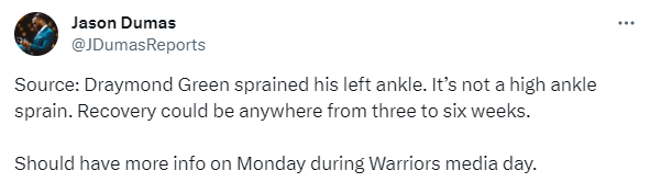 勇士队记Jason Dumas报道,勇士前锋追梦格林扭伤了左脚踝,并非高位脚踝扭伤,但可能需要三至六周的恢复时间。