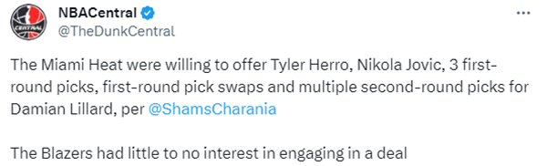 本月早些时候,利拉德经纪人开拓者向总经理克罗宁表示,利拉德愿意回到开拓者参加训练营,利拉德让开拓者知道,为了给球队更多的时间来研究与热火的潜在交易,他愿意在2023-24赛季开始时留在球队,但克罗宁对这种做法表示怀疑,随后开拓者决定在训练营开始前完成交易。