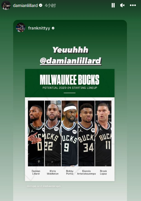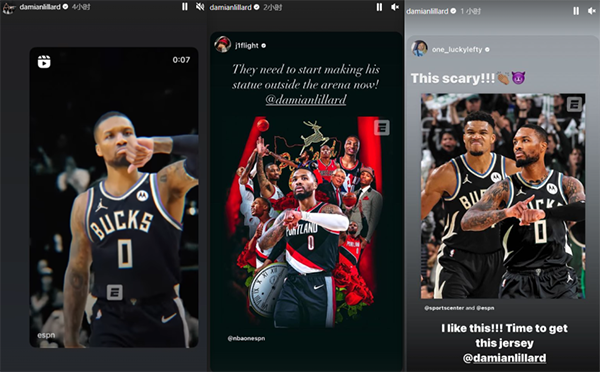 利拉德还连续更新Ins动态,转发自己被交易到雄鹿的报道,转发自己身穿雄鹿0号球衣联手字母哥的P照,转发美媒预测的雄鹿新赛季首发五虎(利拉德、米德尔顿、波蒂斯、字母哥和大洛佩兹),转发昔日字母哥在全明星赛场上首选自己的画面,还转发ESPN动态:利拉德的开拓者生涯结束了。