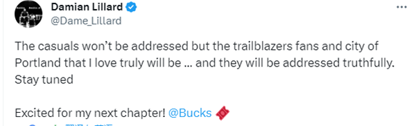 三方交易达成后,利拉德第一时间发推写道:我不会向那些黑子致辞,但会向开拓者的球迷和我所深爱的波特兰这座城市致以真诚的致辞。敬请期待。为我的下一篇章感到兴奋!@雄鹿。
