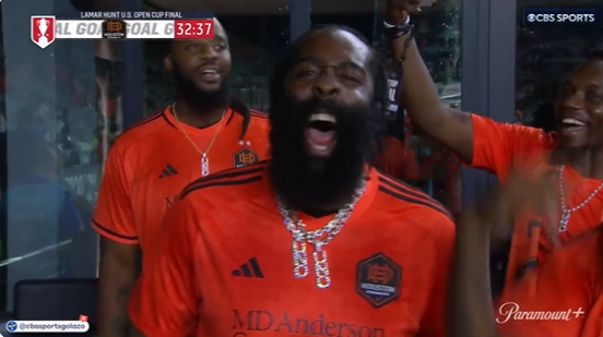 今天哈登以球队小老板的身份观看休斯敦迪纳摩队的比赛,力挺自己的球队并且高呼呐喊庆祝。