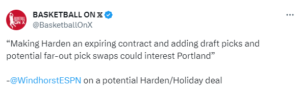 名记Brian Windhorst谈到哈登和霍勒迪互换的潜在交易,表示:哈登拥有一份到期合同,添加选秀权和潜在的签换权可以引起开拓者的兴趣。