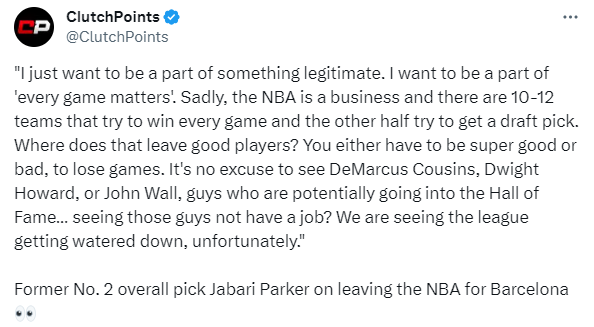 24直播网09月27日讯 近日巴萨男篮球员、2014年NBA榜眼贾巴里-帕克公开批评NBA,炮轰NBA摆烂成风,导致考辛斯霍华德这些名人堂候选者无球可打。