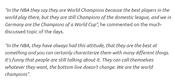 德国夺冠功臣:NBA总冠军只是美国联赛冠军 我们才是世界冠军