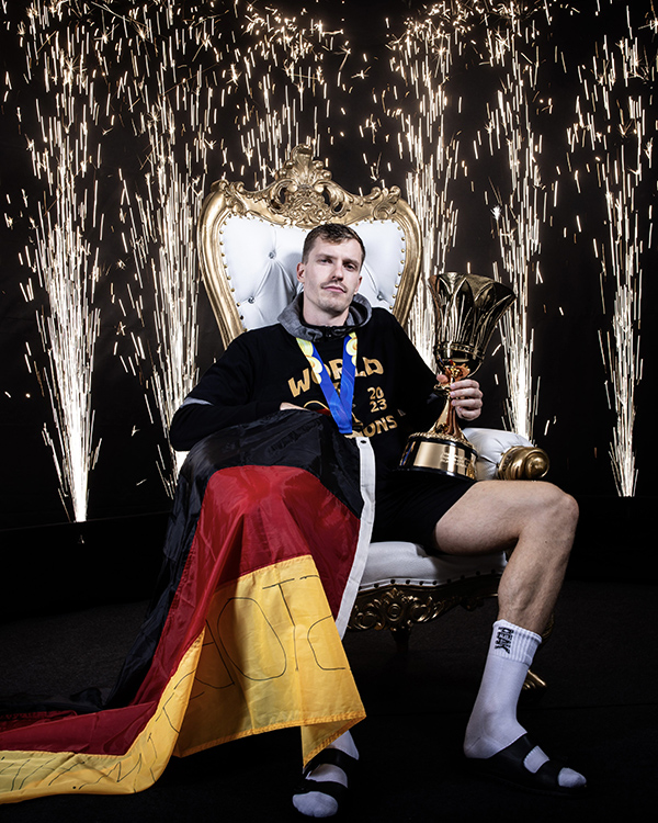 德国男篮夺冠后回国疯狂庆祝,奥布斯特身披国旗、戴着金牌以及抱着冠军奖杯拍摄定妆照,这是属于他们的荣耀时刻。