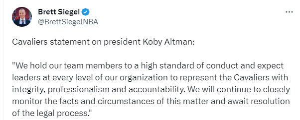 奥尔特曼因酒驾被逮捕后,骑士官方第一时间发表声明:我们已经知晓了这一事件,并将立即启动对事件的调查,以获取更多信息。
