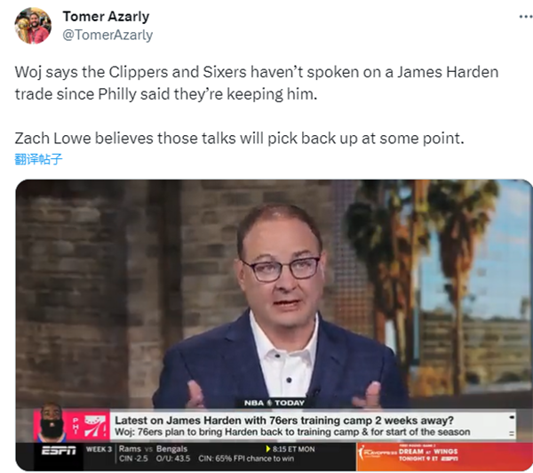 来源:24直播网09-20 10:2524直播网09月20日,据此前报道,快船已经彻底放弃哈登交易,可如今这件事有望出现反转,据名记Zach Lowe报道,快船和76人会在某个时间点重启交易;woj则表示自从他们双方谈判失败后,两队还没有再次谈判,目前76人计划留下哈登开启新赛季。