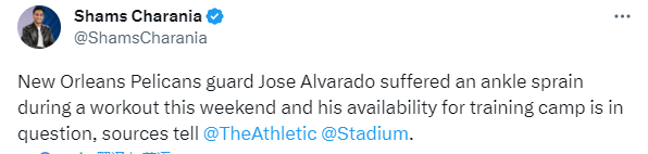 24直播网09月18日,据名记shams报道,鹈鹕后卫阿尔瓦拉多在本周的一次训练中遭遇脚踝扭伤,是否能参加新赛季的训练营存疑;新赛季还没开打,鹈鹕接连遭遇伤病,阿尔瓦拉多扭伤脚踝归期未定,墨菲更是因伤预计伤停10-12周。