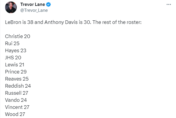 目前湖人队内有14名保障球员,只有詹姆斯(38岁)和浓眉(30岁)的年龄超过30岁,其他球员都很年轻——克里斯蒂20岁,八村垒25岁,海斯23岁,刘易斯21岁,席菲诺20岁,普林斯29岁,里夫斯25岁,雷迪什24岁,拉塞尔27岁,范德彪24岁,文森特和伍德都是27岁。